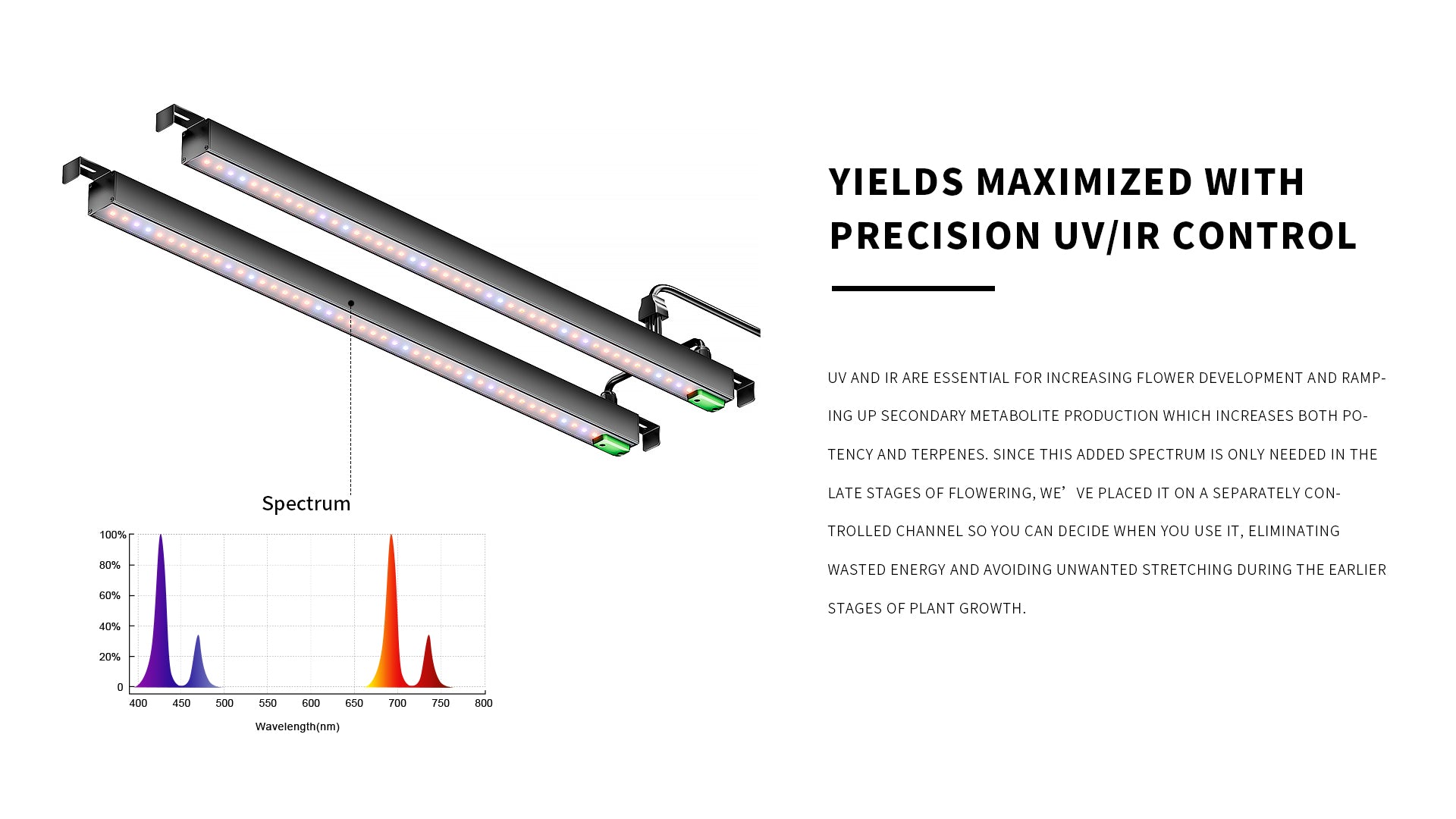 - Special Combination of Spectra: With the addition of UV and IR to the full spectrum, not only does it provide the light needed for the entire growth cycle of the plants, the UV improves plant yield and the IR makes the plants taste better.